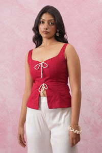 A sleeveless corset-style top featuring a flattering fit, with red bow detailing adding a delicate, feminine touch. The fabric showcases bold blue stripes. This design combines a chic, structured silhouette with playful, vibrant details.