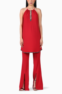 Featuring Red Noir Set by 431-88 Shweta Kapur from The Popsicle Collection. Elevate your elegance in this exemplary Black kurta set, showcasing a halter neckline top with embellished rhinestones detailing on the neckline and the hem of the top. Comes with boot-cut pants.