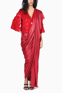 Featuring Red Ocea Sari by 431-88 Shweta Kapur from The Popsicle Collection. This exquisite red sari in knit jersey is light-weight, crush free and easy to wear. Perfect outfit for those fun day weddings.
