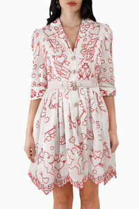 This captivating Silk Linen Embroidered Dress features the winged boyish CUPID - complete with the repertoire of arrows and torch. The blazer style lapel Neckline adds the formal structure needed to balance out the myriad emotions of the lovers. Styled with the adjustable double buckle fabric belt to emphasize the upper waist. Side Pockets are included – a must in every silhouette we design!