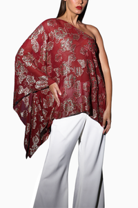Featuring the Red One Shoulder Asymmetrical Flared Top by Swatee Singh. Embrace enchantment in magic purple Georgette. This relaxed-fit, one-shoulder top with an asymmetrical flare is a statement of contemporary elegance.