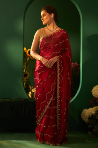 Featuring red saree in organza silk base. The set is crafted with the finest materials and will accentuate the look.