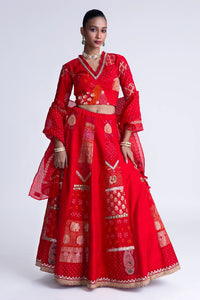 This is a patchwork skirt and blouse, which is made using quilting method to construct fragments of fabric together as one single fabric. It comes clubbed with Bandhani on Pure Organza stole. Both the blouse and skirt comes embellished with hand embroidered borders.