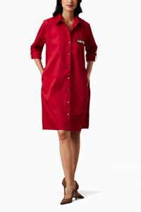 Featuring the Red Pocket Swarovski Shirt Dress by Pallavi Swadi from their Summer Spring 24 collection. This relaxed-fit dress includes a classic collar, visible placket with metal buttons, side pockets, roll-up sleeves, and Swarovski embellishments.