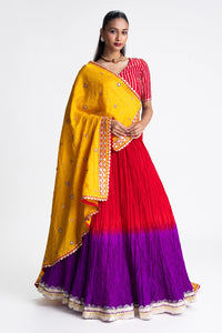 This is red purple shaded crush skirt on silk, with gota lampi borders. It comes clubbed with a mustard Bandhani on silk dupatta that comes embellished with folded gota hand embroidered work. The blouse is red silk with gota lampi highlights.