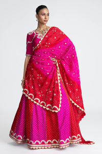This is a Bandhani on silk skirt with alternating red and rani colour kalis. It comes clubbed with a Bandhani on silk dupatta in red rani featuring folded gota hand embroidered work. The blouse is rani raw silk with folded gota work.
