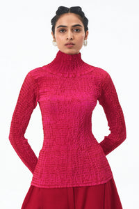 A sculptural take on a skivi achieved through hand crafted shibori, this high neck top features fluid texture that contours your form. Crafted in Silk and dyed in two tones of rani and red, it adds depth to your look making it an easy to style staple.