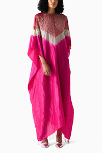 Featuring a free size metallic silk kaftan with our signature shibori triangle neckline.