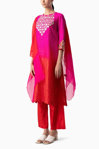 This Bandhani on pure silk kurta has a hand embroidered gota patti yoke. The work extends on the sleeves and back. It comes clubbed with silk pants and organza stole.