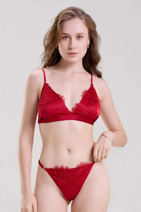 Elevate your lingerie collection with this stunning bralette in vibrant red. Designed with adjustable straps for a perfect fit, it features elegant lace detailing that adds a touch of sophistication. Crafted from luxurious satin fabric, this striking red bralette is complemented by matching lace appliqué and comes with a coordinating red thong, creating a chic and cohesive look. This set is ethically made in our atelier and is finished with our special Mysthelle branded gold hardware.