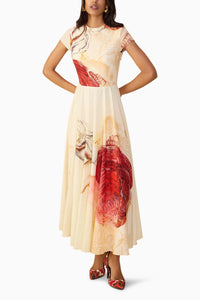 Featuring the Red Scribble Julia Dress by Saaksha & Kinni's Akara Collection A/W'25. A high-neck summer pleated dress in abstract print with short sleeves, combining crisp silhouettes and lightweight design for transitional weather.
