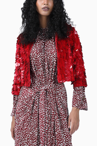 Featuring Red Sequin Leo Jacket by 431-88 Shweta Kapur from The Popsicle Collection. Embrace your style in this striking delicately hand embroidered short jacket adorned with sequin in silk base and a quarter sleeves. A perfect essential for this wedding season.