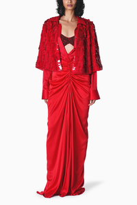 A handcrafted statement cape delicately embroidered with sequin of different sizes‚ from the shoulder to the waist . Structured with padded shoulders, it sits comfortably over your body. Wear it over your saris or your draped skirt for that extra bling and drama.