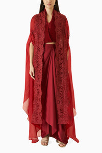 Redefine your charming look with this Red Signature Organza Cape Set. A classic red wrinkle blouse with organza cape and lungi skirt is cut in satin fabric, it assures a soft and soothing touch against the skin. Style this set with a pair of high heels & statement earrings.