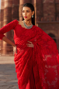 Featuring Silk Organza Saree with Off Shoulder Blouse by Rose Room from it's Hue De Paradise Collection. This applique work red saree paired with a full-sleeve off-shoulder blouse creates a striking and elegant ensemble that combines traditional craftsmanship with modern style. The saree, in a rich red hue, serves as a bold and festive canvas adorned with intricate applique work. Appliques typically feature detailed designs or motifs crafted from fabric, enhancing the saree's texture and visual appeal.
