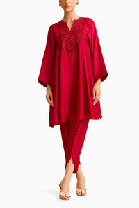 Featuring Red Silk Short Kurta with Tulip Pant by Ridhi Mehra from Love Rosetta Collection. Brighten your look with this red silk flared short kurta, complemented by matching tulip pants. Its vibrant hue and flowing design make it a striking choice for elegant, eye-catching style.