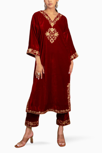 Red Silk Velvet Embroidered Kurta Set