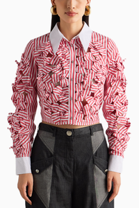 Featuring the Red Stripe 3D Flower Shirt by MellowDrama's Utopia Collection. Crafted from 100% cotton, this cropped full-sleeve shirt showcases handcrafted 3D florals on the front and sleeves. It features a contrast collar and cuff, a front opening with buttons, and a tailored fit, combining elegance with a modern aesthetic.