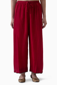 Thangka pyjama in burgundy Habutai silk, featuring intricate dabka and beadwork at the hem. A hand-hemmed haze-colored facing introduces refined contrast, paired with an elasticated waistband for comfort and balance.