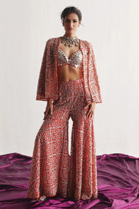 The Red Tulle Sharara Pants from the Rangrez collection by 29 India are a statement of elegance and grace. Rendered in a striking red hue, these pants are crafted from luxurious tulle fabric and adorned with exquisite mirrorwork and beadwork embroidery. The tailored fit enhances the silhouette, making it a versatile choice for festive and formal occasions.