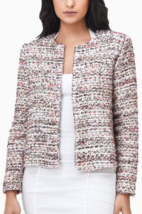 Step into sophistication with the Red Velvet Tweed Jacket. The structured silhouette and rich, multi-tonal tweed pattern exude elegance, while the classic open-front design ensures versatility. Perfect for layering, this piece effortlessly transitions from daytime polish to evening glam, offering a timeless addition to your wardrobe.