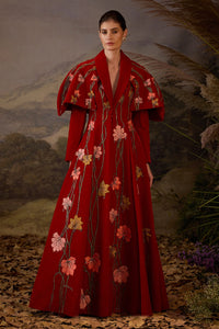 A red velvet floor length gown with lapel neck that showcases unconventional embroideries involving silk thread colorful work.