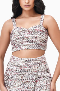 Step into effortless elegance with this cropped tweed top. Its structured fit and wide straps create a flattering silhouette, while the subtle mix of warm tones adds a playful yet refined touch. Perfect for pairing with high-waisted skirts or trousers for an elevated day-to-night look.
