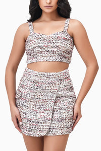 Crafted from rich tweed fabric, this set brings a bold yet refined style. The crop top features a sweetheart neckline and wide straps for support, while the mini skirt includes a front crossover flap detail and a functional side pocket for added charm and convenience. The skirt is a mid-rise fit complements the cropped top for a flattering silhouette, creating a versatile set perfect for daytime or evening wear.