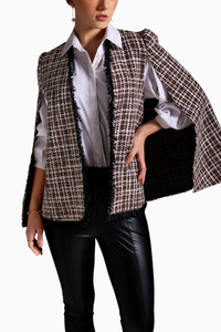 Elevate your party style with our wine-red shiny tweed cape. Featuring a front armhole cut and delicate lace detailing, this piece offers a regular fit with extra ease. Perfect for making a statement, this cape is designed to make you growl and shine at any party.