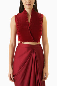 The Red Wrinkle Wrap Blouse is that classic sexy blouse you need in your wardrobe. Designed with a Wrap V neck and a curved shaped hemline. It works as a great option to either wear with your saris or with pants for a cool modern look.