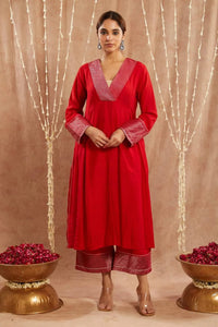 The Red Zari Chanderi Kurta with Narrow Pants is a striking blend of traditional elegance and modern style. The kurta, made from Chanderi fabric, is adorned with intricate zari work on the neckline and features delicate gota lace detailing on the joints. Paired with straight-leg pants, this set offers both comfort and sophistication