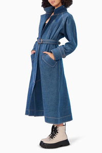 This chic denim overcoat combines a clean, classic cut with a playful edge. Featuring a whimsical queen of hearts embroidery and a belt with an engraved metallic buckle, it’s perfect for casual days and evenings, adding unique personality to any outfit.