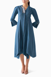 The Reef petrol cotton leaf embroidered dress features a midi length with leaf appliqué on the neckline and cuffs. This concealed placket dress has full sleeves with bell cuffs, contrast piping details on the panels, and side pockets. With a fit-and-flared silhouette, it offers both style and comfort.