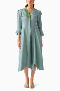 The Reef sea foam cotton twill leaf embroidered dress features a midi length with leaf appliqué on the neckline and cuffs. This concealed placket dress has full sleeves with bell cuffs, contrast piping details on the panels, and side pockets. With a fit-and-flared design, it combines style and comfort effortlessly.