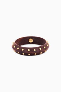 Add a touch of boho chic to your outfit with our REGAL BALL BANGLE. This wooden bangle is adorned with golden balls, creating a unique and stylish statement piece. Perfect for any occasion, this bangle is sure to catch eyes and turn heads.