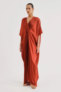 Featuring the Regal Kaftan in Rust from Aroka's Signature Collection, crafted in lustrous modal satin for an elevated, regal touch. The ruched V-neckline brings subtle definition to its flowing silhouette, striking the perfect balance between ease and elegance. Designed for versatile styling, it transitions effortlessly from festive soirées to resort escapes.