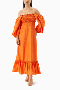 The Regina dress features elasticated design across the chest and puff sleeves with elasticated cuffs,  sleeve length is just below the elbow. It's crafted in crisp 100% silk taffeta, has a voluminous frill at the hem and is ankle length. As for styling, you can wear it on and off shoulder as you please.