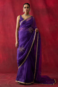 Featuring a stunning purple silk organza saree, delicately hand embroidered for a touch of timeless elegance. Paired with a silk Chanderi blouse, also hand embroidered, this ensemble blends tradition with refined craftsmanship, perfect for special occasions.