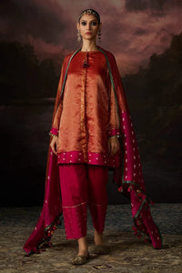 Featuring Rehana Rust Pink Kurta Set With Dupatta by Swatti Kapoor’s Firdaus collection. This stylish set includes a Banarasi Chanderi brocade tunic, cotton cambric salwar, and handwoven Chanderi dupatta in rust and rani pink, with exquisite hand embroidery.