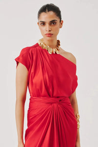 Featuring the Renaissance Blouse in Red from Aroka's Signature Collection, a one-shoulder silhouette crafted in lustrous modal satin. The soft cowl drape cascades gracefully down the bodice, creating an elegant, fluid effect. Designed with a relaxed fit to complement a variety of body shapes with effortless style.