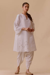 The quintessential chogastyle kurta set that will seemlessly take you through the warmer months of the year. Our Resham kurta features semisheer cutwork details and is paired with a flattering dhoti and kota doria dupatta.