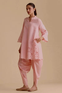 The quintessential chogastyle kurta set that will seemlessly take you through the warmer months of the year. Our Resham kurta features semisheer cutwork details and is paired with a flattering dhoti and kota doria dupatta.