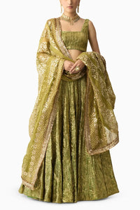 Composition: Lampi, Silk Organza Lining: Cotton, Shantoon Color: Green Gold Closure: Back Hook And Side Zip Components: 3 Product Code: SVEITRHE002