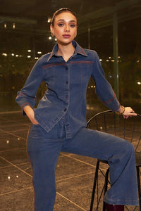 A denim coord set with red thread tailoring features classic denim with bold red stitching, adding a pop of color and modern edge.
