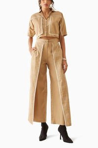 Reza cropped shirt with a yoke and flap panels detail. The shirt has contrast piping and top stitch details, half sleeves and a lapel collar. Paired with panelled trouser with Domino printed flap with contast piping and top stitch detail.
