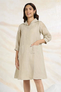 Featuring the Rhinestone Cowboy Dress in 100% linen, this relaxed fit piece showcases a square cut design with a collared neck, continuous placket, and half sleeves with cuffs. Rhinestone studs cascade from the shoulders, complemented by contrast flat felt seam stitch details for a bold, contemporary style.
