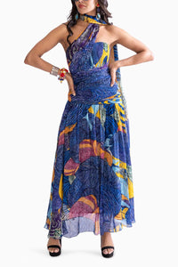 Featuring Rianna Blue Dress by Saaksha & Kinni from Botanica Collection. A tribal print maxi dress with a sleeveless design, adorning a hand micro pleat bodice, cross neck detailing, and a dramatic hanging trail. This look combines intricate texture with bold patterns for an elegant, eye-catching effect.