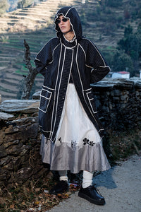 This Black Jacket features a thoughtfully placed pannels in kantha, the front is elevated with a multiple kantha detail pannels , adding a sharp structure to the silhouette Contrast kantha stitch & running stitches with piping details on the seams trace the jacket on both front and back, lending quiet texture and detail