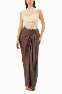 Exude refined style with Ritika Arya Jain's Rim Cream Top with Mouse Drape Skirt. This two-piece coord set combines the elegance of crepe and satin in a cream and mouse color palette, offering a true-to-size fit and a chic, flowing silhouette.