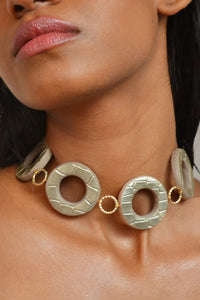 A reversible choker with champagne gold, croco embossed leather on one side and a beige suede with a patchy silver foil on. The back chain and hooks are gold plated on brass.